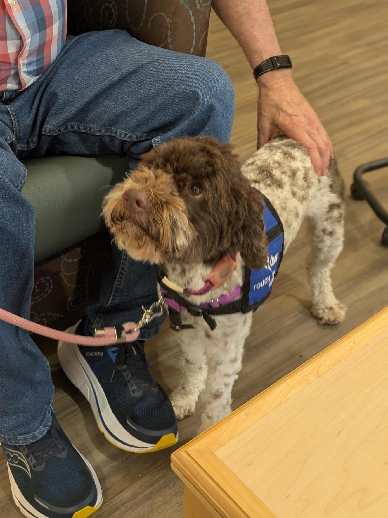 One unforgettable moment occurred with a patient near the end of their life who was without family present but had a lifelong love of dogs. During a visit, Charlie—typically not a “kisser”—approached the patient, who reached out his hand. In that moment, Charlie gently gave him kisses, offering comfort in a way words never could.