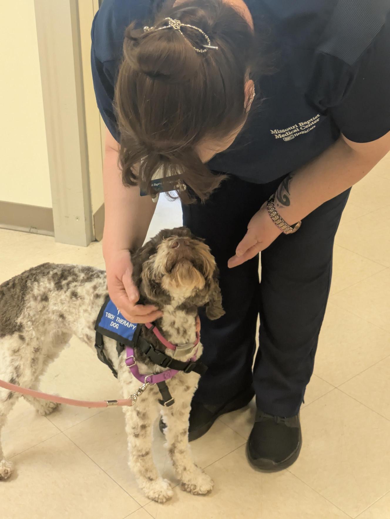 Today, that mission has grown far beyond its humble beginnings. What started with one team has grown to 15 touch therapy teams at MoBap and more than 300 touch therapy teams across the St. Louis metro area, reaching countless individuals in need of emotional support. At MoBap alone, Debbie has brought the program to life alongside seven beloved dogs—Sookie, Charlie, Georgie, Pippa, Opie, Perry, and Frankie—with new teammates like Lanie currently in training.